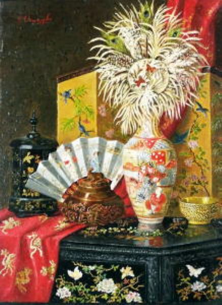 Stilleben mit asiatischen Deckelgefäßen, Fächer und Vase