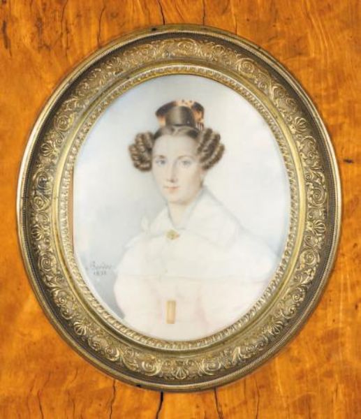 | Portrait en buste de jeune femme aux yeux bleus en robe rose ornée d'une ceinture à boucle dorée, un bijou à son col brodé de de | |