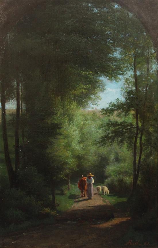 Cow herd on a lane in woodland and painted with faux arch