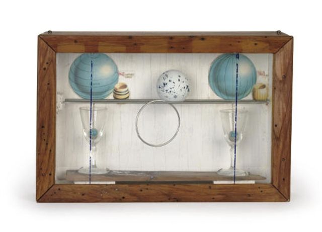 | Wood rinted paper collage, gouache, glass, marbles | |