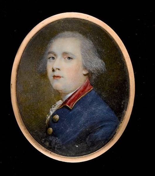 | A Gentleman, wearing blue coat with gold edged red collar and gold buttons, white lace cravat and powdered hair | |