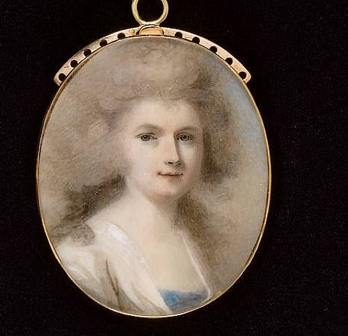 A Lady, wearing a blue dress and white robe, her hair powdered.