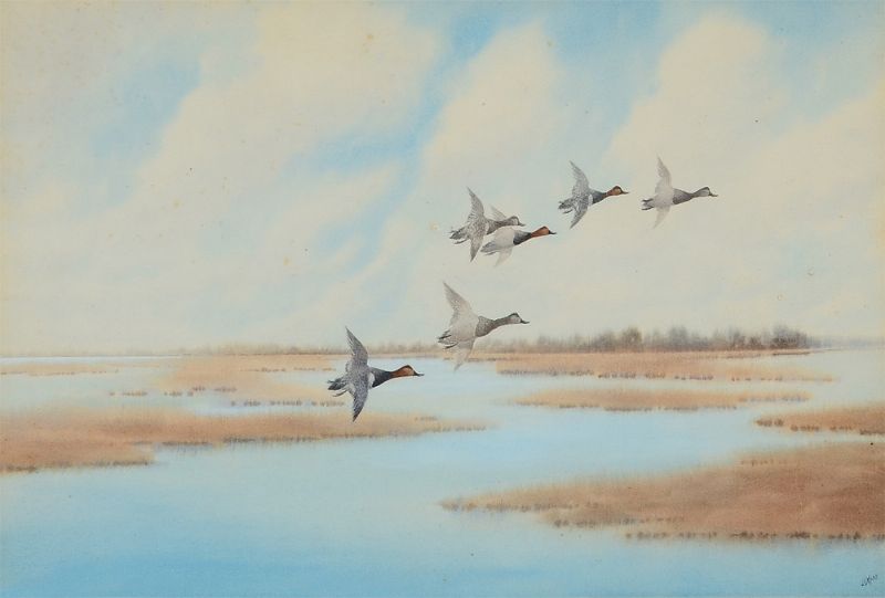 Ducks in Flight over a Marsh