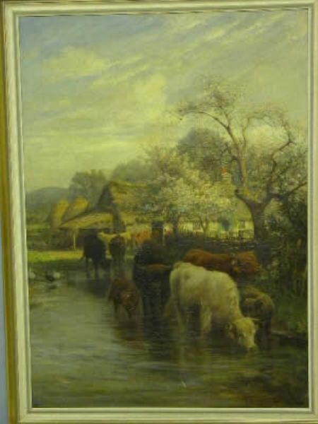 | Highland Cattle watering, with thatched croft and milk maid beyond | |
