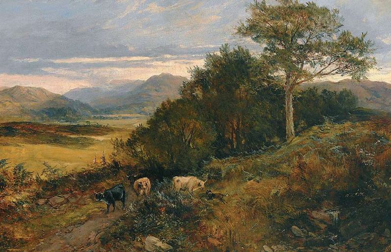 Spätsommerliche schottische Landschaft mit heimkehrenden Kühen
