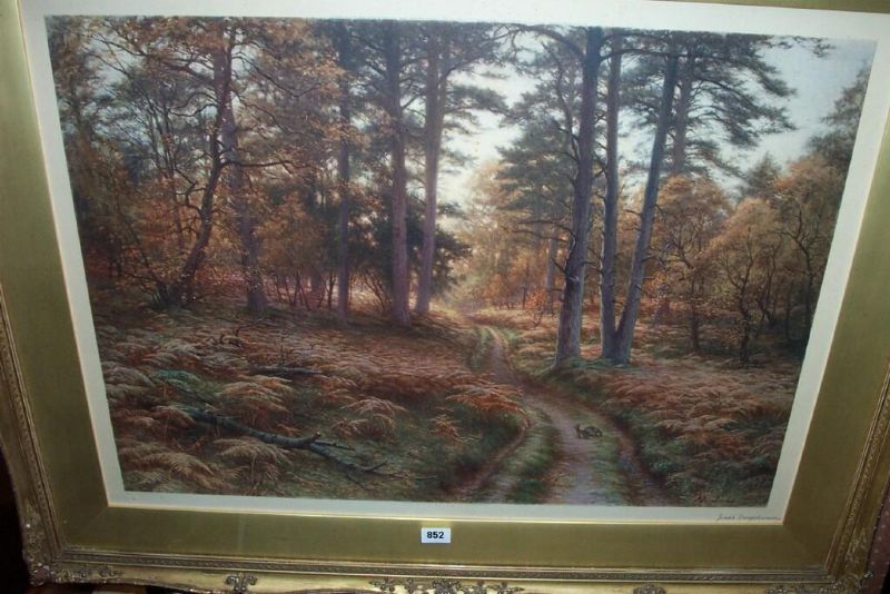 a woodland scene in autumn with rabbits on a pathway