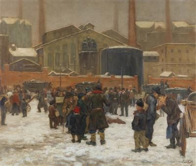 Crowd in front of a factory in winter