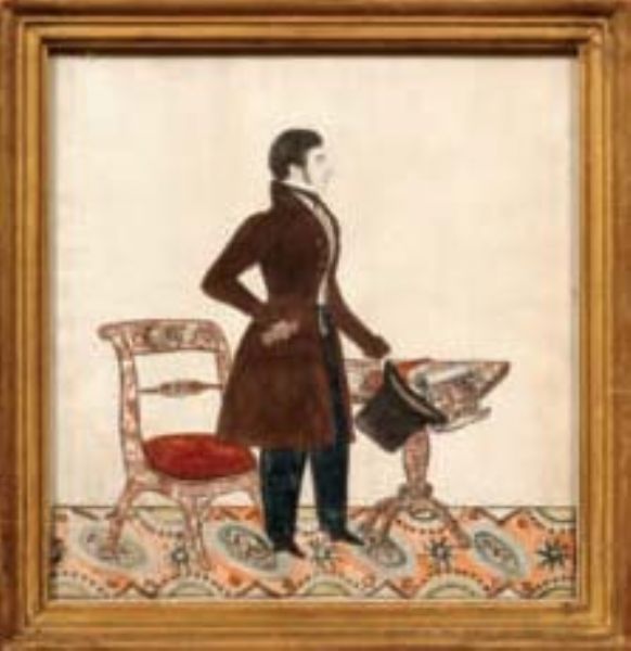 MAN WITH TOP HAT STANDING BESIDE A CHAIR AND TABLE ON A COLORFUL CARPET.