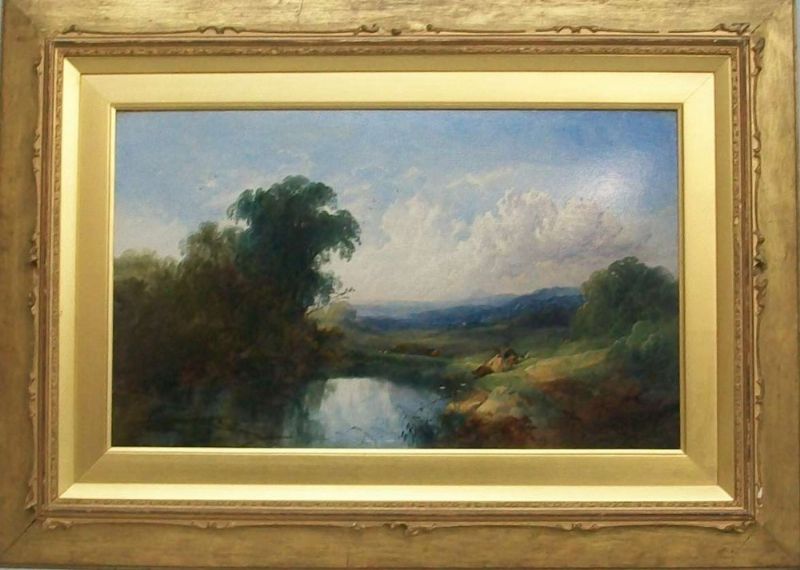 a pair of landscape scenes with men fishing beside a river