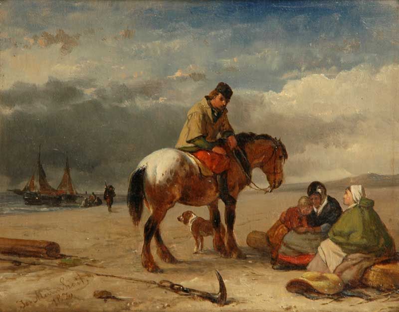 Ruiter bij visvrouwen op het strand
