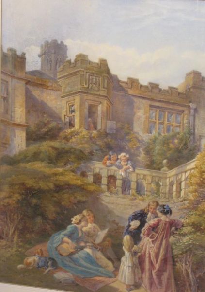 igures conversing by a Terrace, a country house beyond