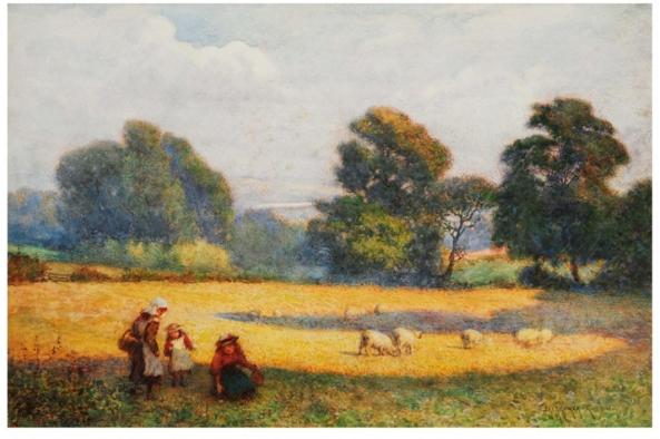 A mother with children in a sun drenched field with sheep
