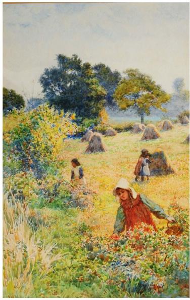Children gathering flowers in a field with hay stacks
