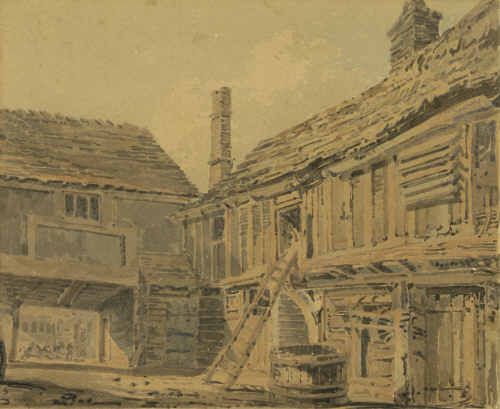 | Courtyard with timbered Buildings and Wooden Step Ladder, figures and a horse and cart in the distance | |