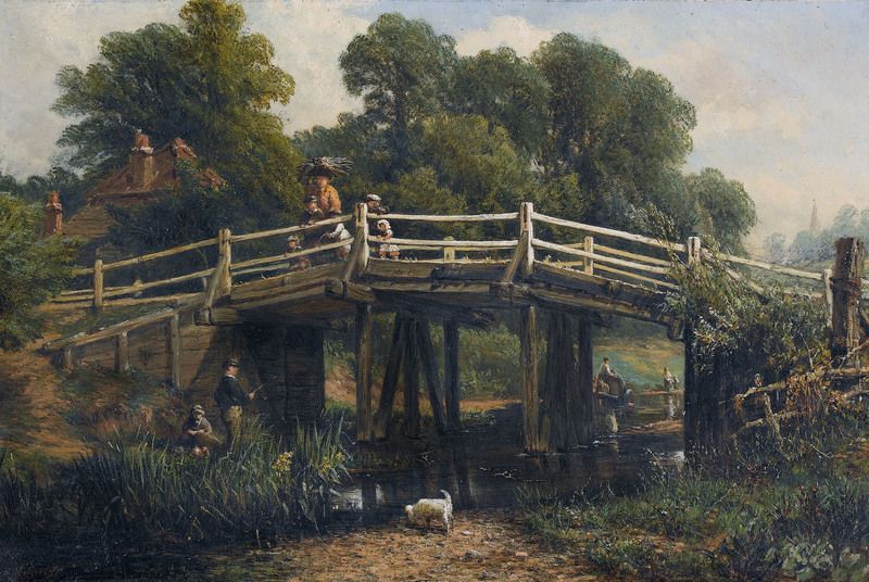 Landschaft mit Holzbrücke und Staffage.
