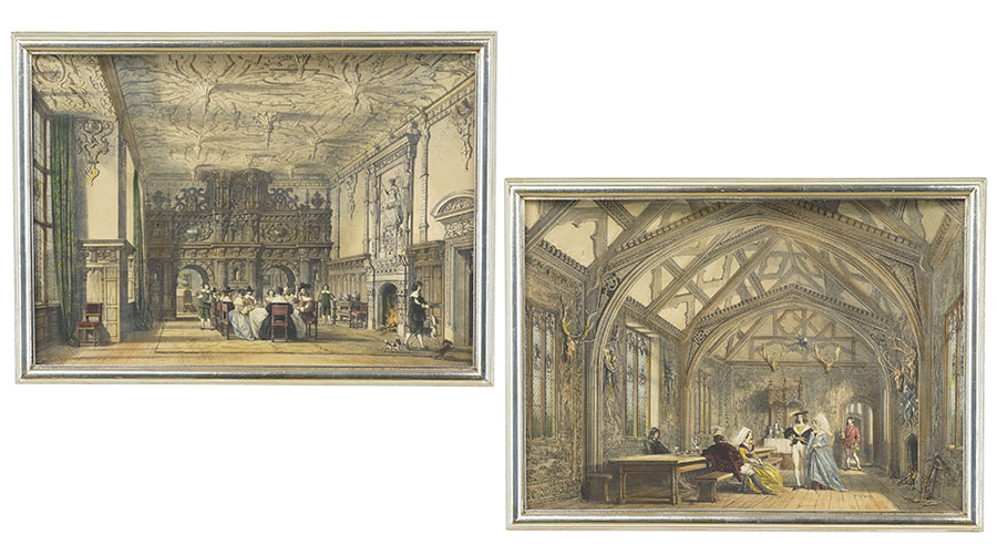 | TWO 19TH CENTURY HAND-COLORED LITHOGRAPHS. 'Banqueting Room, Bramhall, Cheshire' and 'Hall, Crewe Hall, Cheshire' | |