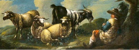 Rastender Hirte mit Ziege und Schafen in Hügellandschaft