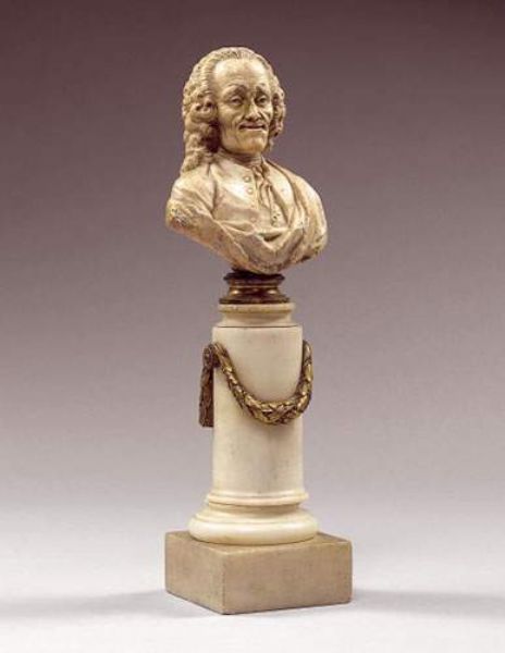 | Petit buste en pierre sculptée représentant Voltaire en perruque. | |