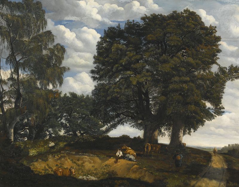 Idyllische Wegpartie mit Vieh und rastendem Hirten.