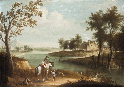 Idealized river landscape with rider, mother and children