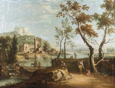 | Idealized southern river landscape with castle-like buildings, two anglers and Figurenstaffage | |