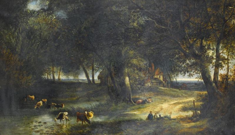 WOODED LANDSCAPE WITH FIGURES AND LIVESTOCK NEAR A HOUSE