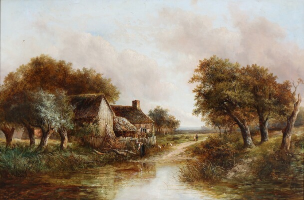 | An English landscape with people near a cottage by a lake | |