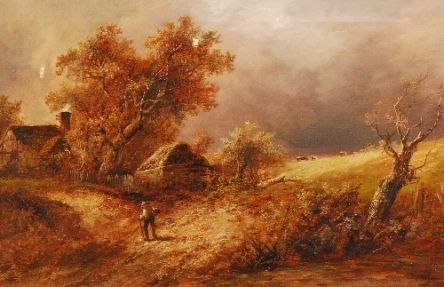 figure on a country path near cottages beneath a sombre sky