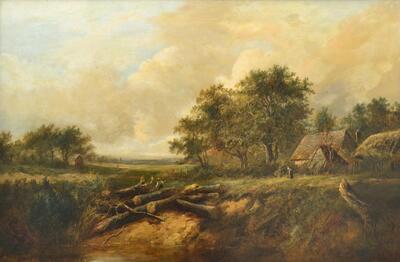 Riverside cottage with figures in a wooded landscape