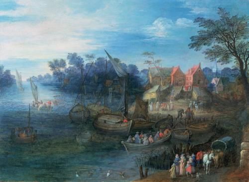 A RIVER LANDSCAPE WITH TRAVELLERS AND FIGURES IN BOATS, A VILLAGE BEYOND