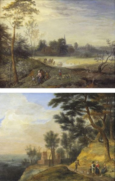 | A LANDSCAPE WITH TRAVELLERS IN THE FOREGROUND, A CHURCH BEYOND | |