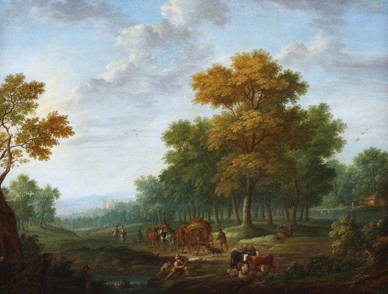 | Landscape with travellers by foot and horse-drawn cart. In the front a shepard with his sheep, a castle at the horizon | |
