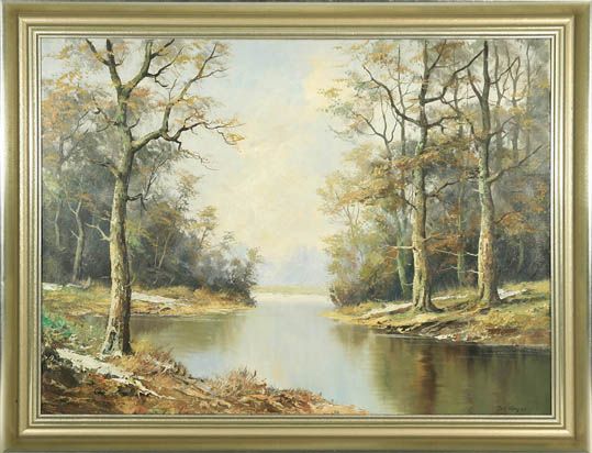 | Morgenstimmung an einem Frühjahrstag. Unter den Bäumen am Ufer eines kleinen Sees liegen noch die Reste des Schnees | |