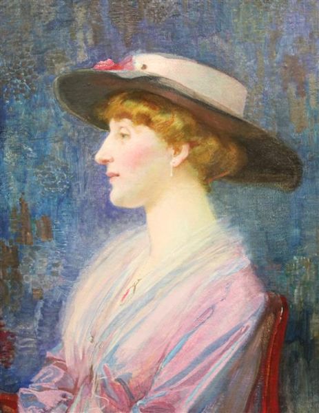 | Portrait of a lady wearing a broad brimmed hat and pink dress | |