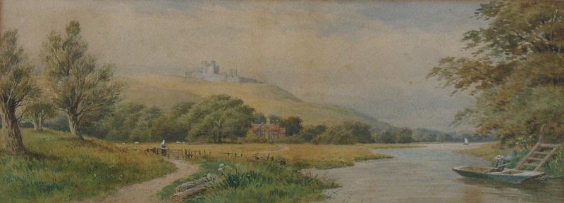 A rural landscape with river, figure in a punt and a castle on a hillside,