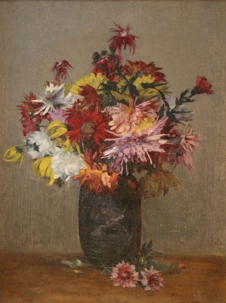 Still Life Study of Chrysanthemums in a Blue Pottery Vase