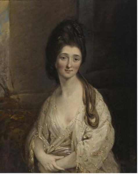 A portrait of a lady in a white and gold flowered dress
