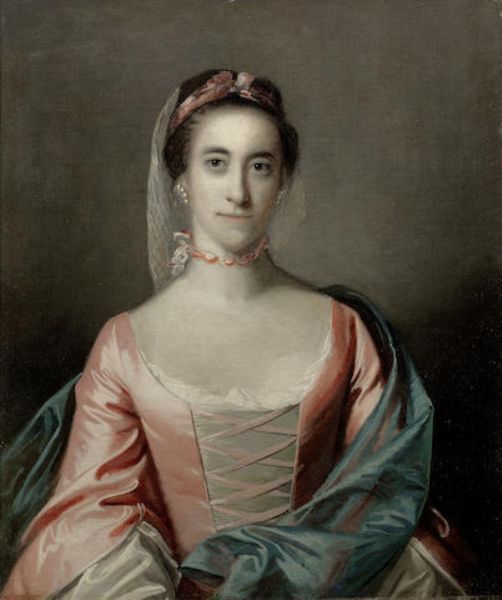 | Portrait of a lady, half length, in a pink dress with a blue wrap | |