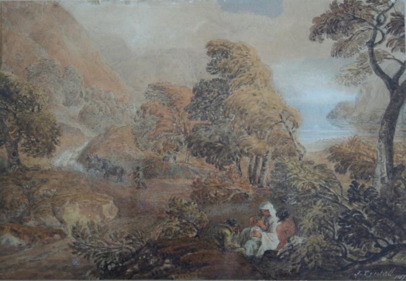 FIGURES IN A WOODED LAKE LANDSCAPE