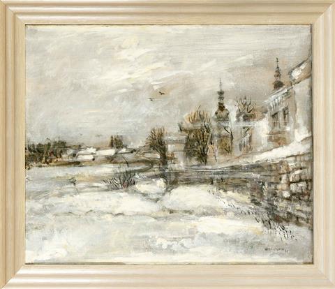 zeitgenössischer, polnischer Maler, städtische Winterlandschaft im Schneegestöber