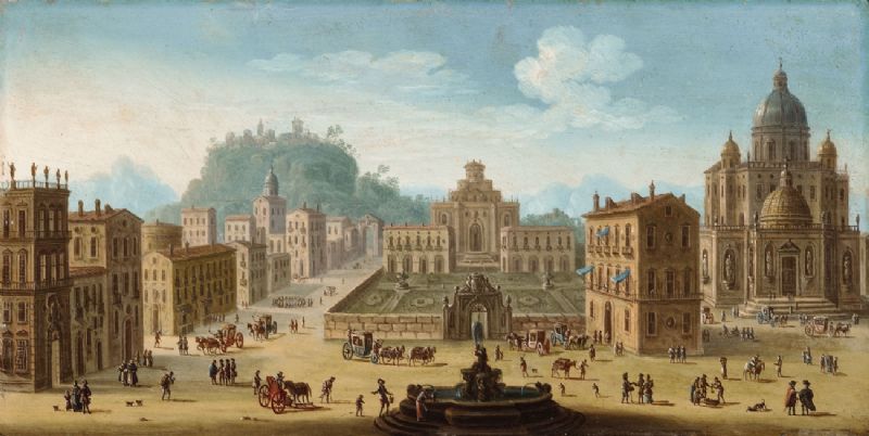 Phantastische Palastanlage mit Brunnen, Kuppelkirche und reicher Staffage