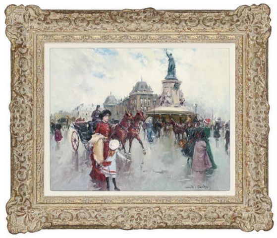 Elegant figures in a Parisian square