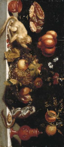 | Grapes and pomegranates in a wicker basket with candied fruit on a tazza, earthenware and two marmosets on a stone ledge and fru | |