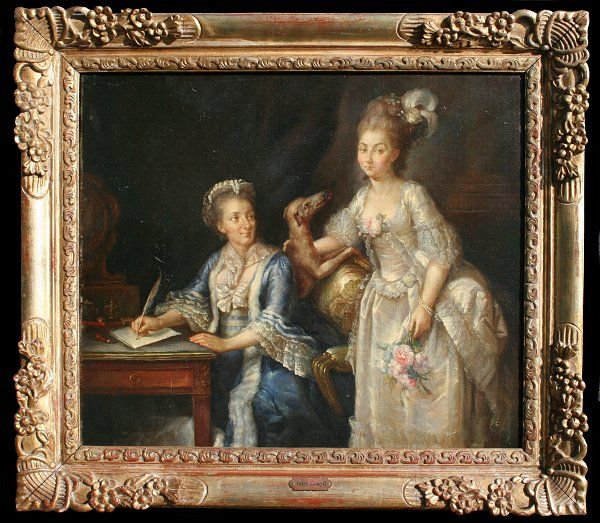 Two Ladies Penning a Letter with Playful Dog in an Interior