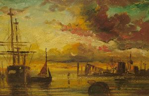 Ships moored at sunset