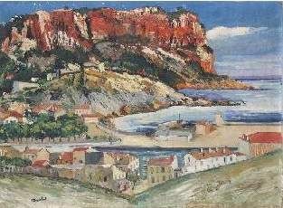 Küstenlandschaft mit Bucht, Häusern und großem Felsmassiv