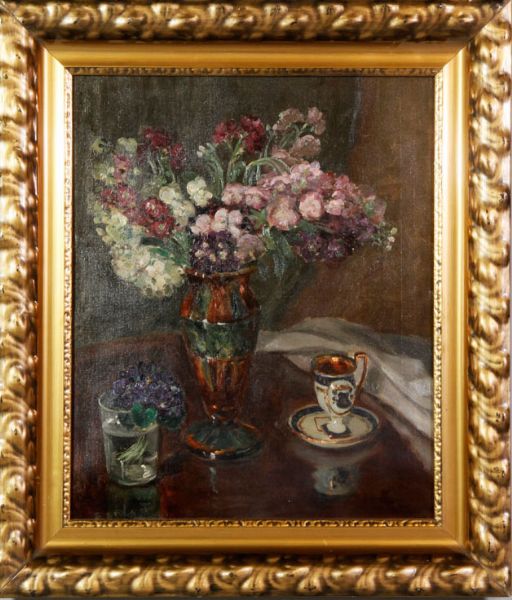 Still life with flowers, cup and saucer