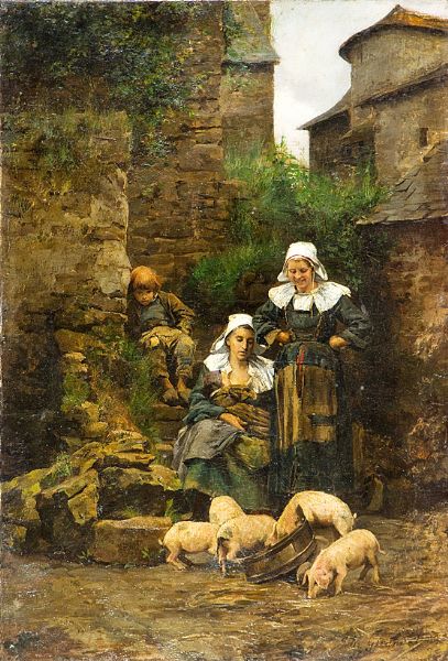 | Hofecke. Zwei junge Bauersfrauen und rotblonder Knabe, fünf jungen Ferkeln beim gierigen Fressen zuschauend | |