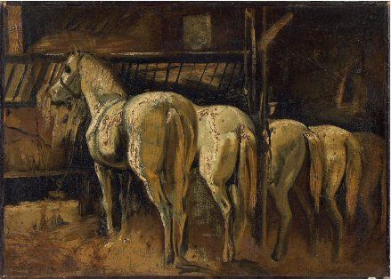 Cinq croupes de chevaux à l'écurie