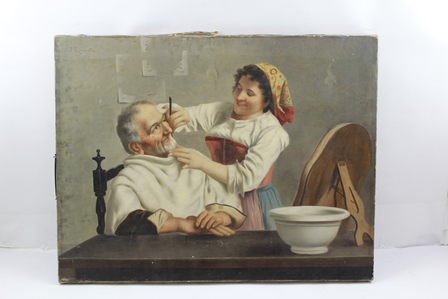 | Close Shave, depicting a young woman shaving an elderly man, with a cut throat razor, a bowl and mirror on the table | |